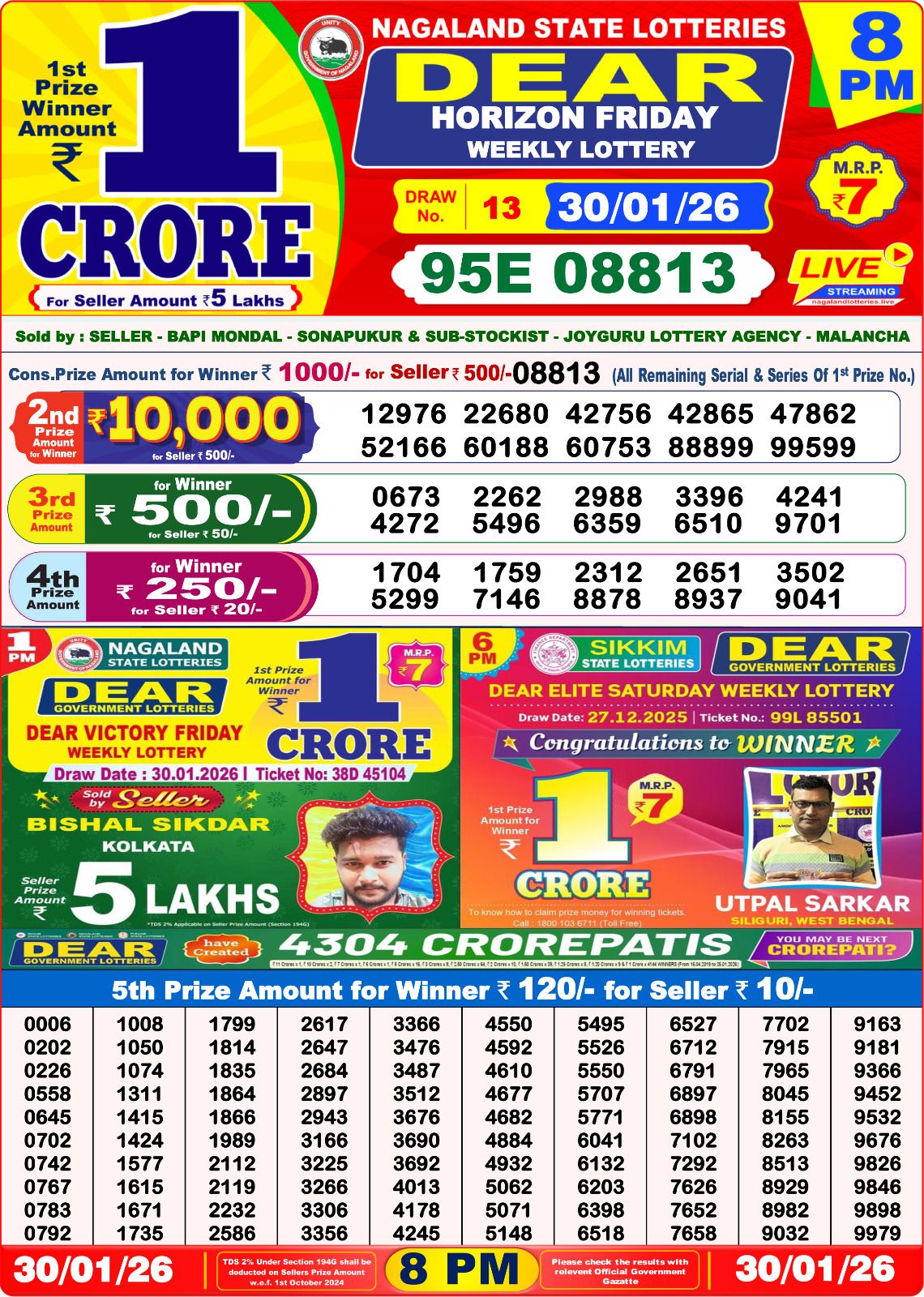 Dear Lottery Sambad 8 PM Nagaland State Lottery 30-01-2026