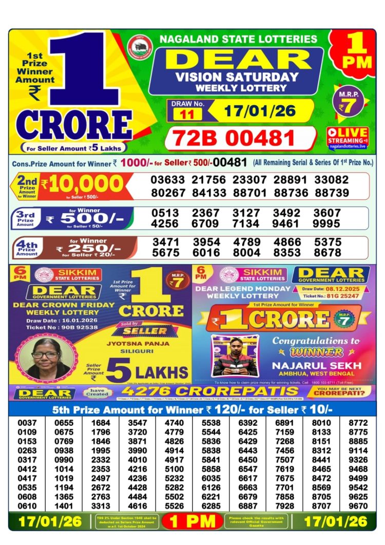 Nagaland Lottery Sambad Today 17.01.26 1:00 PM |Dear Lottery