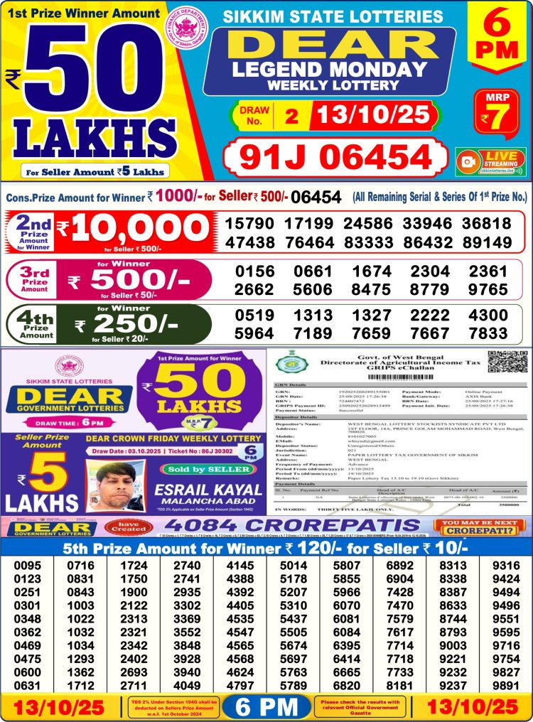 Sikkim Lottery Sambad Today 13.10.25 6PM Dear Lotteries
