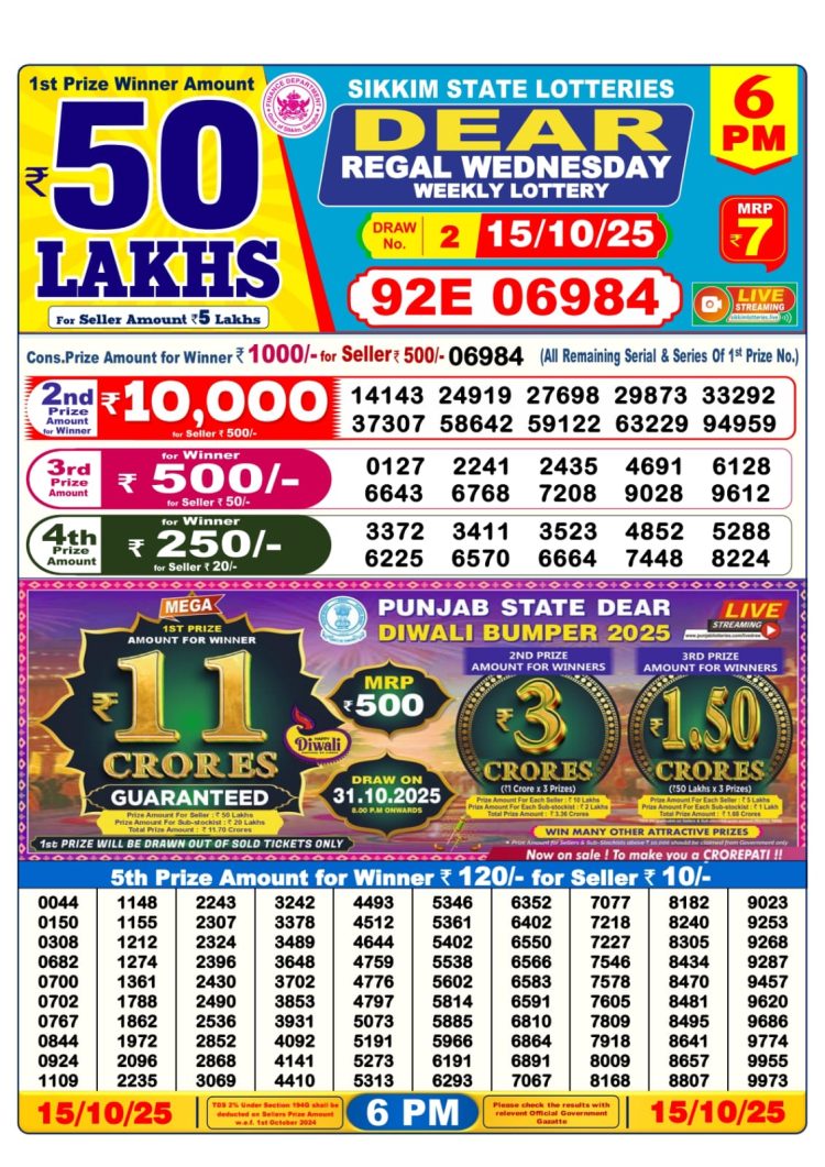 Sikkim Lottery Sambad Today 15.10.25 6PM Dear Lotteries